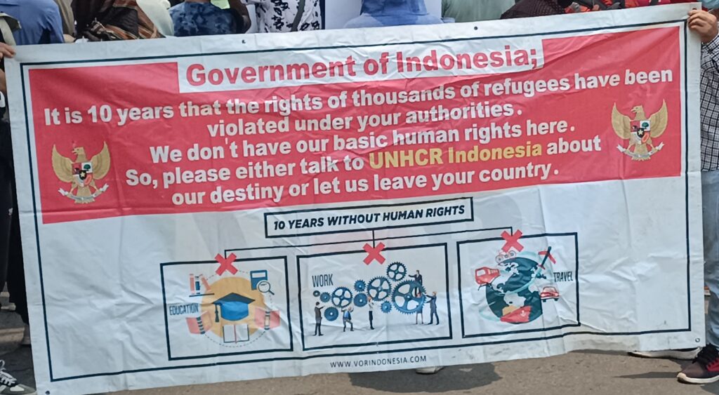 Para pengungsi menegaskan bahwa selama 10 tahun mereka hidup di Indonesia, mereka tidak mendapatkan haknya sebagai manusia, seperti tidak boleh bekerja, sulit mengakses pendidikan, dan tidak mendapatkan jaminan kesehatan. Banyak yang mengalami detensi tanpa batas waktu, bertentangan dengan prinsip non-refoulement internasional. UNHCR dinilai gagal memastikan perlindungan, bahkan justru memperpanjang penderitaan dengan birokrasi yang lamban dan tidak transparan.